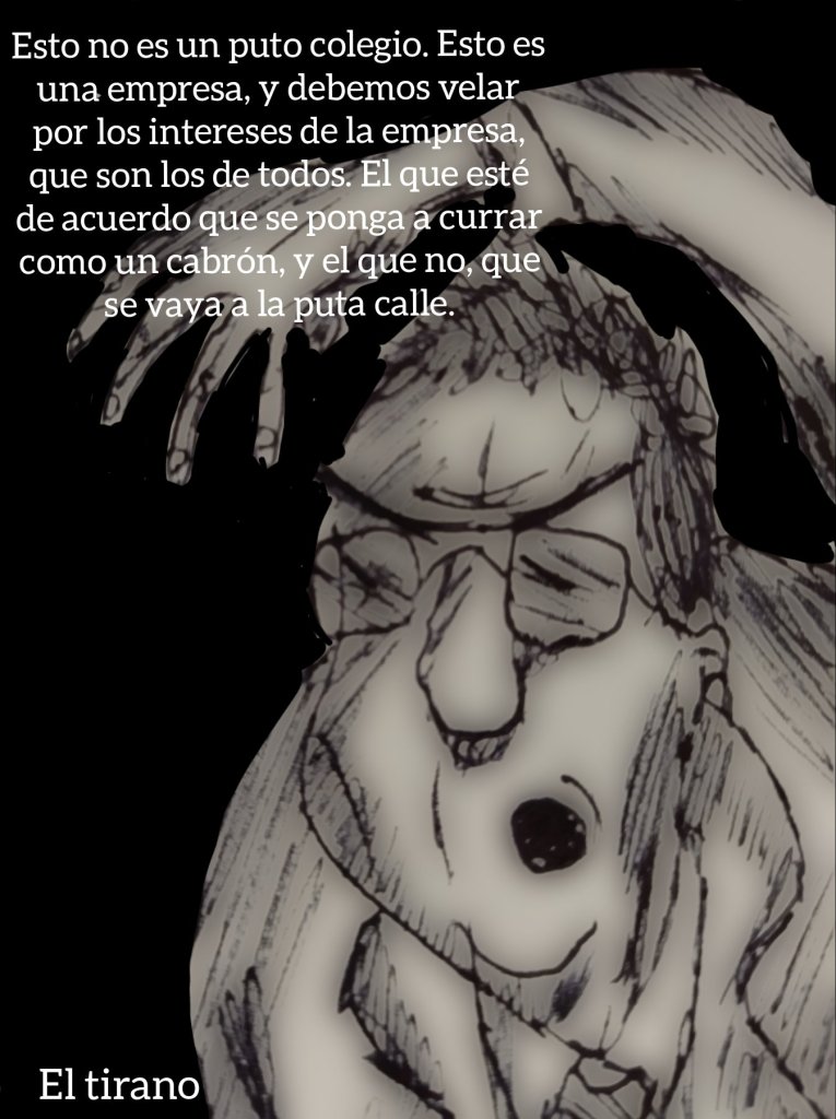En este caso nos encontramos con JM, nuestro tirano particular. Un tipo taxativo, rotundo, despótico, brutal, como todo buen tirano que se precie, aun cuando hablamos de espacios tan desacostumbrados, pero a la vez tan habituales, como puede ser nuestro propio entorno de trabajo. Y es que todos, en distintos momentos de nuestras vidas, hemos tenido que lidiar con personajes como este: personajes crueles y caprichosos de cuya voluntad aleatoria dependen a veces nuestros destinos, más que como colectivo (que también), como simples individuos; personajes infames con cuya desgracia, castigo o improbable redención fantaseamos libremente en nuestro fuero interno cuando el peso del trabajo con que pretenden anularnos nos lo permite. Personajes, personajillos, sí. Siniestros y risibles. En este relato intentaremos hacer un ejercicio de improvisación libre en torno a nuestro tirano, trataremos de ahondar en sus motivaciones, en los sentimientos que despierta a su alrededor, las ansias de justicia/venganza de sus subalternos, los posibles finales que deberían aguardarle a poco que dichas ansias se vieran satisfechas, para terminar con una reflexión quizás peligrosa sobre el uso y abuso del poder como ente ajeno a nuestra propia voluntad.